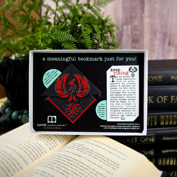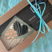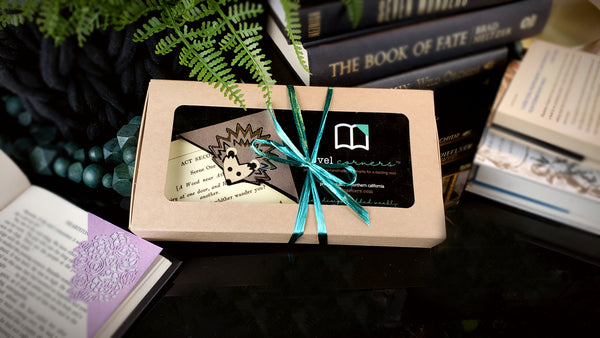 Our Novel Corners™ are made of high quality cardstock, printed papers and permanent adhesive vinyl. Everything is layered and assembled with strong glue to ensure a durable bookmark to last you many reads. Special care should be taken to keep it looking beautiful. Make sure your hands are clean (free from excess oils, lotion, dirt, food or residue). The bookmark is made of paper and will absorb moisture, so keep it out heat, direct sunlight and high humidity just as you would a book.