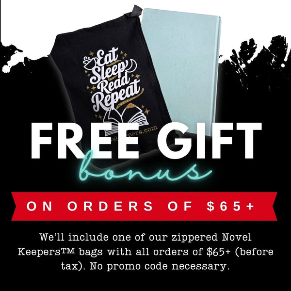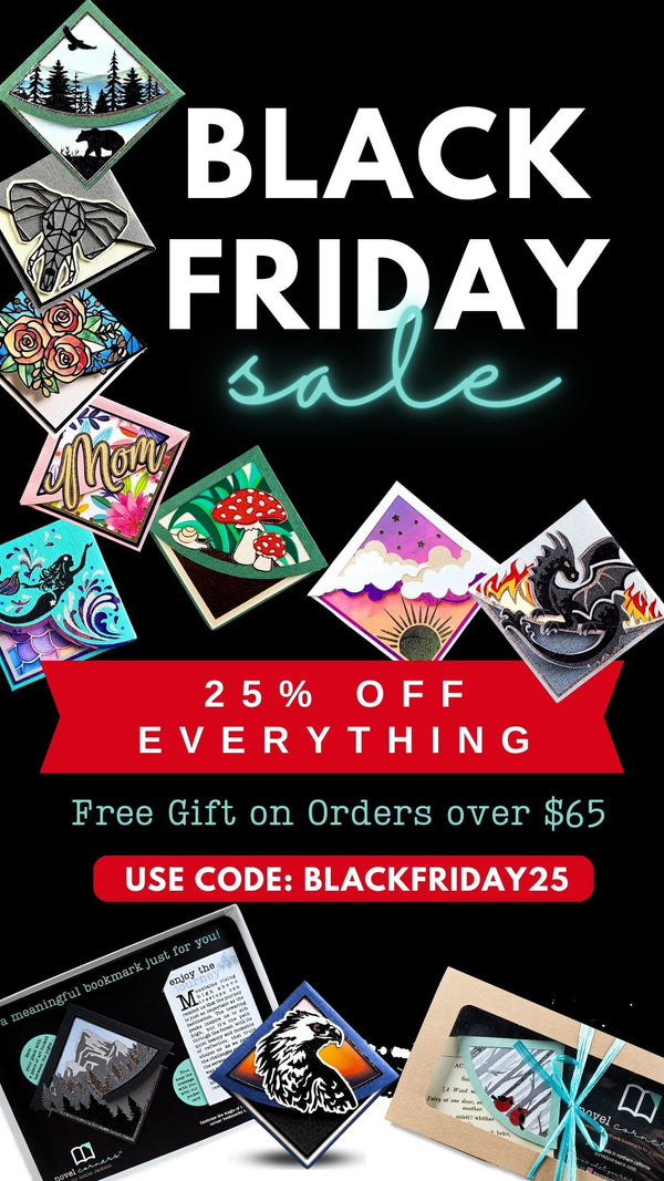 Our Novel Corners™ are made of high quality cardstock, printed papers and permanent adhesive vinyl. Everything is layered and assembled with strong glue to ensure a durable bookmark to last you many reads. Special care should be taken to keep it looking beautiful. Make sure your hands are clean (free from excess oils, lotion, dirt, food or residue). The bookmark is made of paper and will absorb moisture, so keep it out heat, direct sunlight and high humidity just as you would a book.