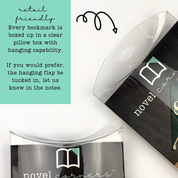Every bookmark is boxed up in a clear pillow box with hanging capability make it very easy to add at point of sale on either a countertop display or stand.