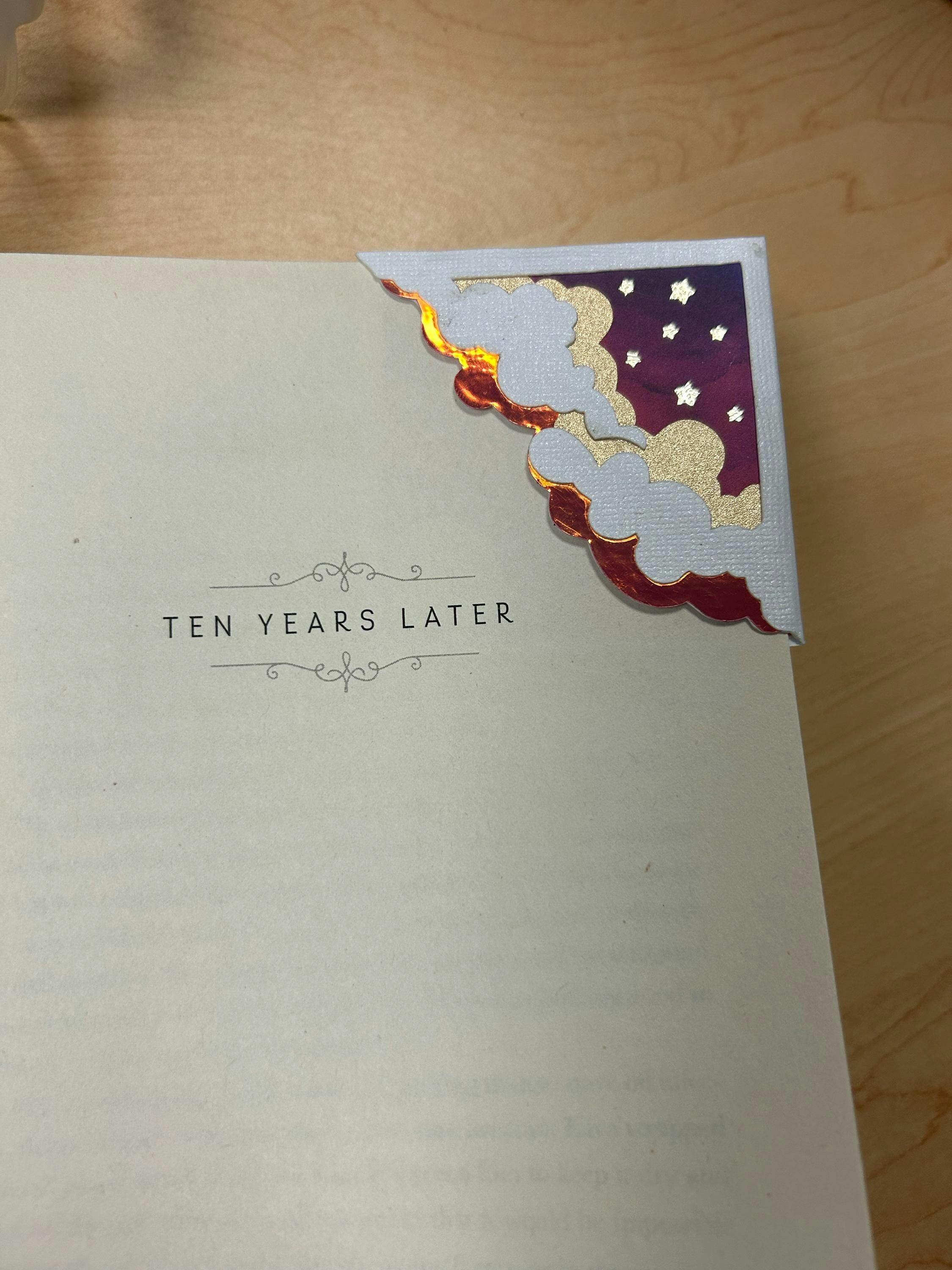 Our Novel Corners™ are made of high quality cardstock, printed papers and permanent adhesive vinyl. Everything is layered and assembled with strong glue to ensure a durable bookmark to last you many reads. Special care should be taken to keep it looking beautiful. Make sure your hands are clean (free from excess oils, lotion, dirt, food or residue). The bookmark is made of paper and will absorb moisture, so keep it out heat, direct sunlight and high humidity just as you would a book.
